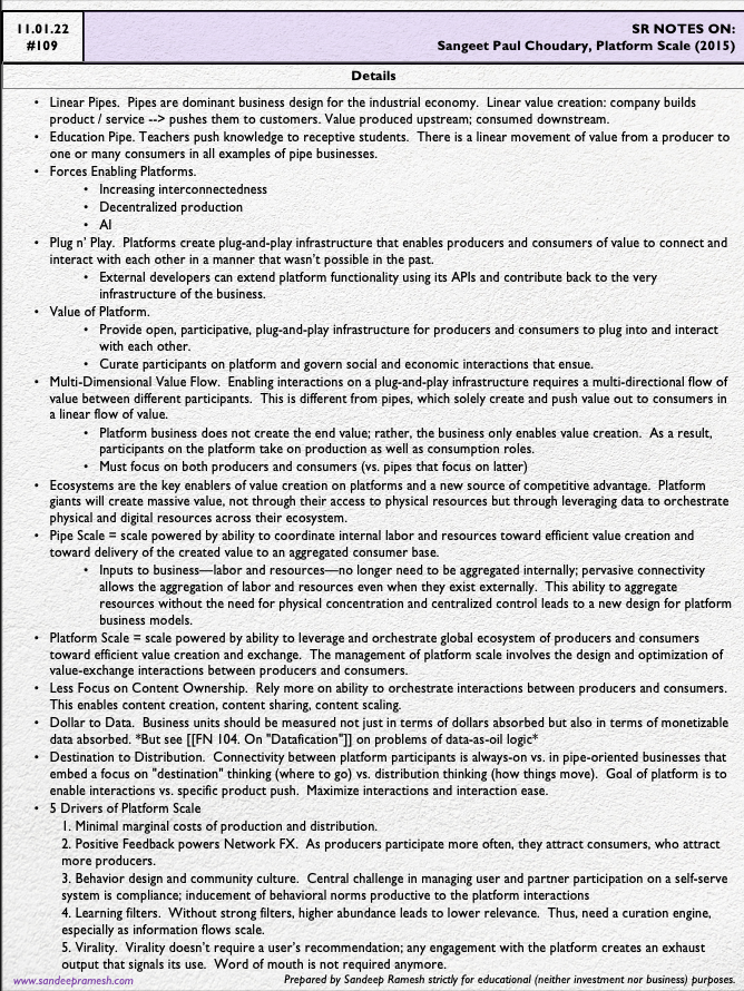 "At their core, platforms enable a plug-and-play business model. Other businesses can easily connect their business with the platform, build products and services on top of it, and co-create value. Platforms primarily benefit not from internal production but from a wider source of open co-creation and open market interactions. This ability to drive interactions through a plug-and-play infrastructure is a defining characteristic of platform scale." (p. 33)