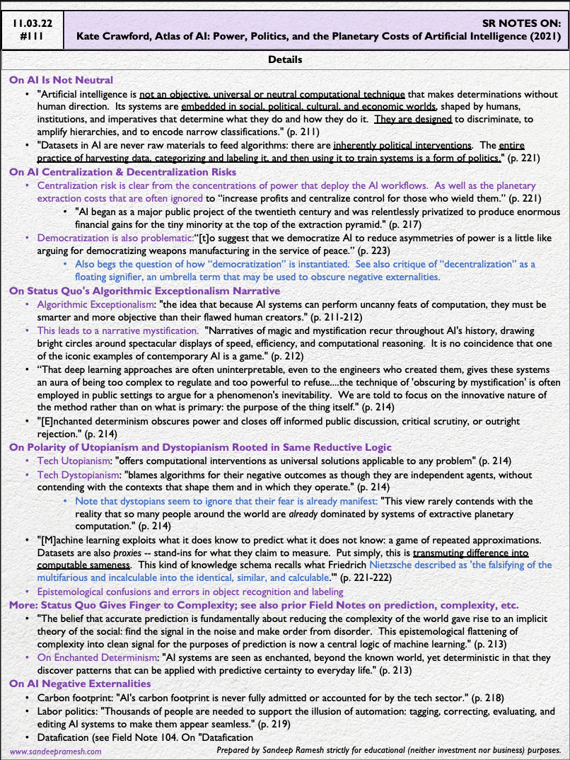 The pragmatic question I'm pondering is how to deploy and tune an existing investing / risk / interdisciplinary skill stack in harmony with the concluding statement of Kate Crawford's Atlas of AI, the subject of this Field Note: