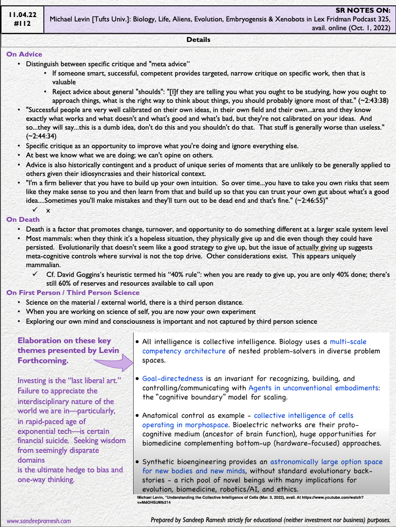 One recommendation was to ingest Michael Levin's 3 hour talk with Lex Fridman on the latter's eponymous podcast (see ep. 325). So I did.