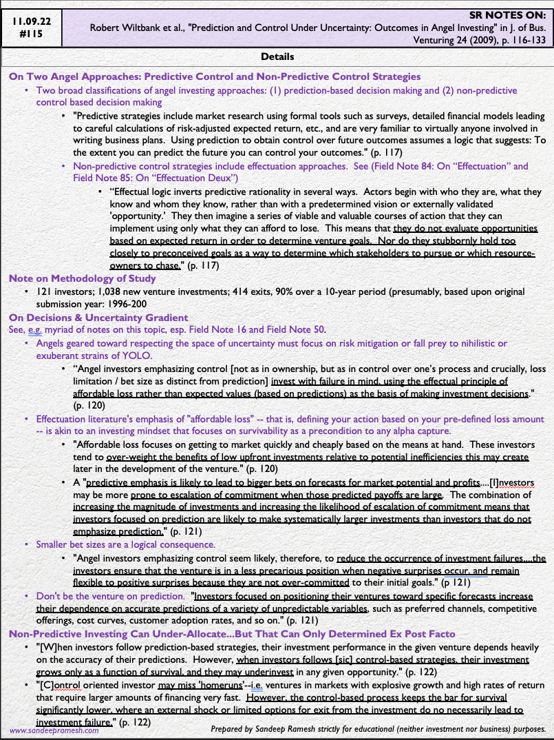 "Results show that angels who emphasize prediction make significantly larger venture investments, while those who emphasize non-predictive control experience a reduction in investment failures without a reduction in their number of successes." (p. 116)