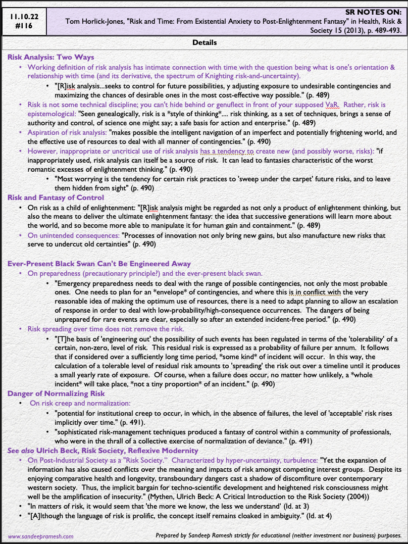So, perhaps these Notes that deepen my appreciation (if not understanding) of risk serve to make up for missed opportunity. Or perhaps the lost time has actually served to concentrate my mind and sharpen my sense of responsibility (from the ground, not a high horse) for what to do about the pervasive risk ignorance, at a minimum in the investing domain, but hopefully beyond.
