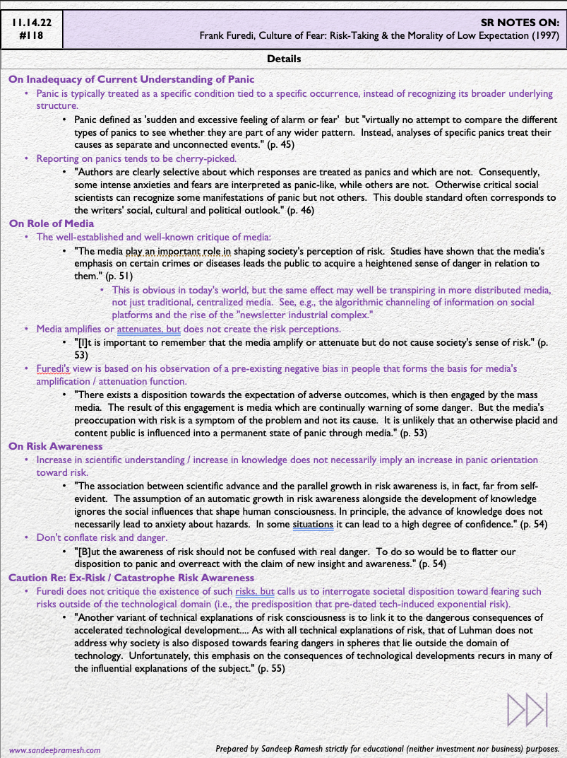 As Field Note #117: On "Decision Integrity + Impoverished (Investor) Subject" most recently explored, the hyperturbulence of our times is not merely theoretical; it has become deeply felt. The valence of this feeling might be characterized as "panic," the topic of Frank Furedi's chapter titled "Why Do We Panic?" that is found in his 1997 text, Culture of Fear.