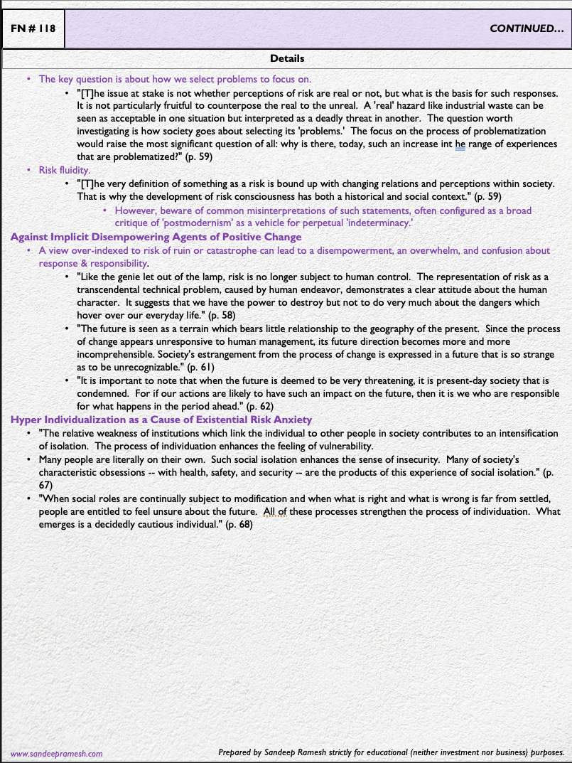 "The coincidence of the process of individuation with a mood of social pessimism helps to produce a sense of cynicism regarding the merit of social engagement. This lack of belief in the problem-solving ability of human beings helps to heighten the sense of vulnerability. It is this convergence of insecurity with the sense that we have run out of answers that makes society feel that it is entitled to panic." (p. 70)