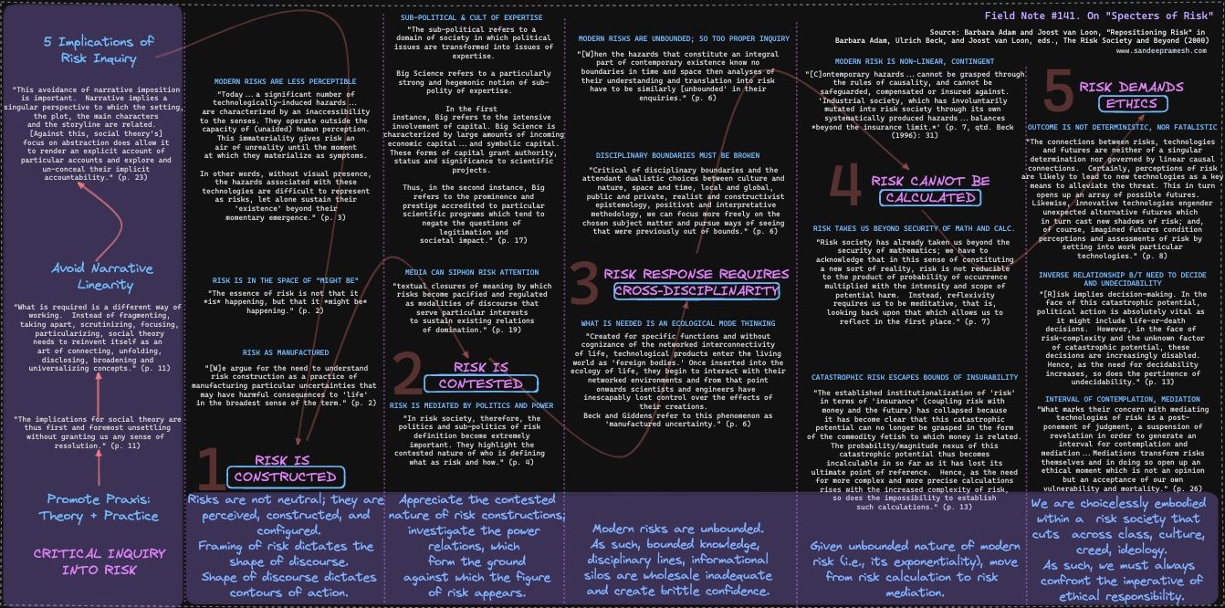 The industrialized society has given way to what Ulrich Beck theorized as the modern "risk society." Beck's seminal text Risikogesellschaft was published (in the original German) in 1986, was translated into English in 1992, and continues to be strikingly prophetic in the technological age of "the exponential." (See also, e.g., Field Notes 16, 62, 97, 101, 105).