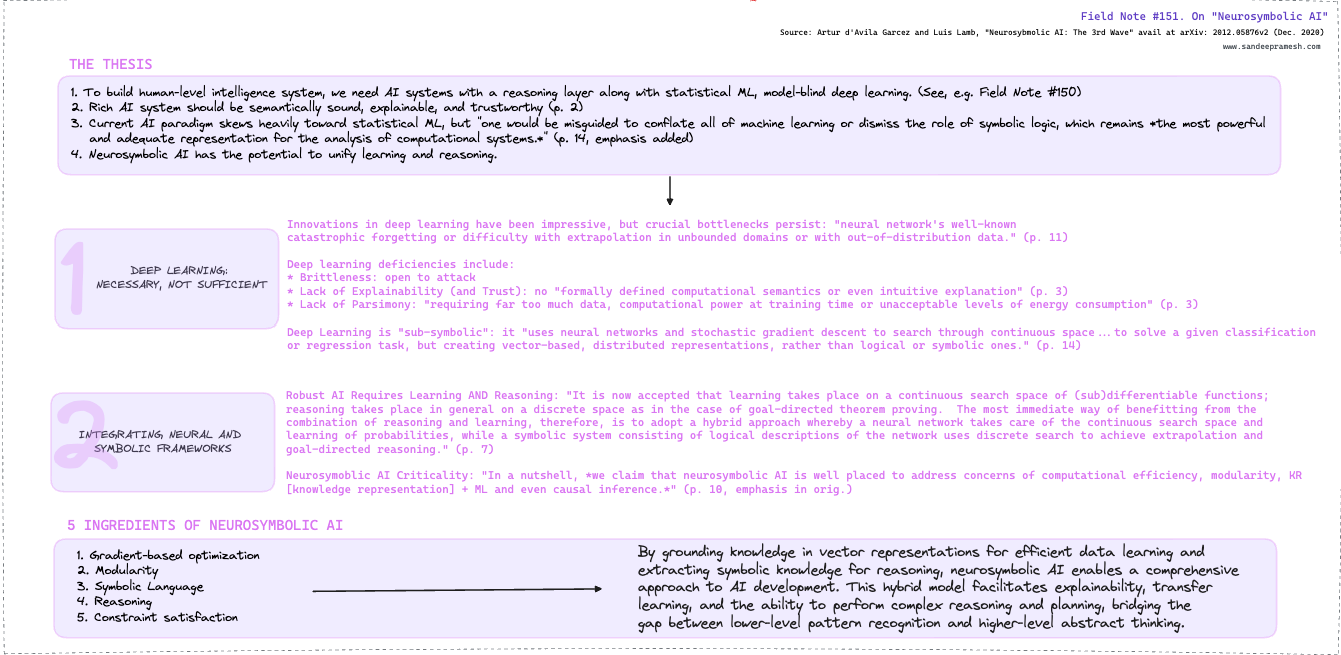 - To build human-level intelligence system, we need AI systems with a reasoning layer along with statistical ML, model-blind deep learning. (See, e.g. Field Note #150)