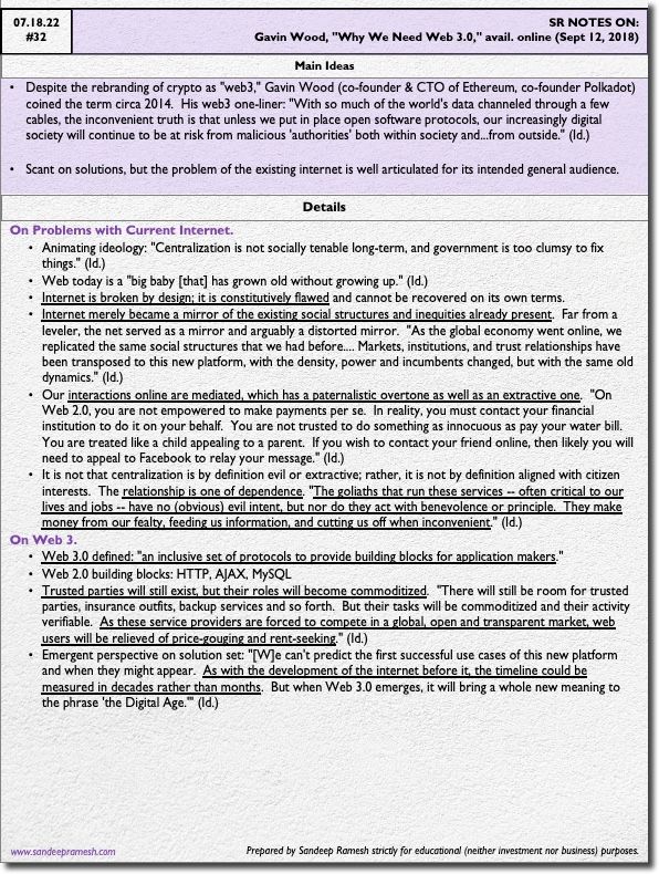 Despite the rebranding of crypto as "web3," Gavin Wood (co-founder & CTO of Ethereum, co-founder Polkadot) coined the term circa 2014. His web3 one-liner: "With so much of the world's data channeled through a few cables, the inconvenient truth is that unless we put in place open software protocols, our increasingly digital society will continue to be at risk from malicious 'authorities' both within society and...from outside." (Id.)