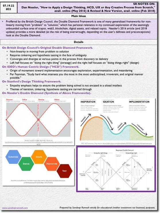 Proffered by the British Design Council, the Double Diamond Framework is one of many generalized frameworks for non-linearly moving from "problem" to "solution," which has personal relevance in my continued exploration of the seemingly unbounded surface area of crypto, web3, blockchain, digital assets, and related topics.