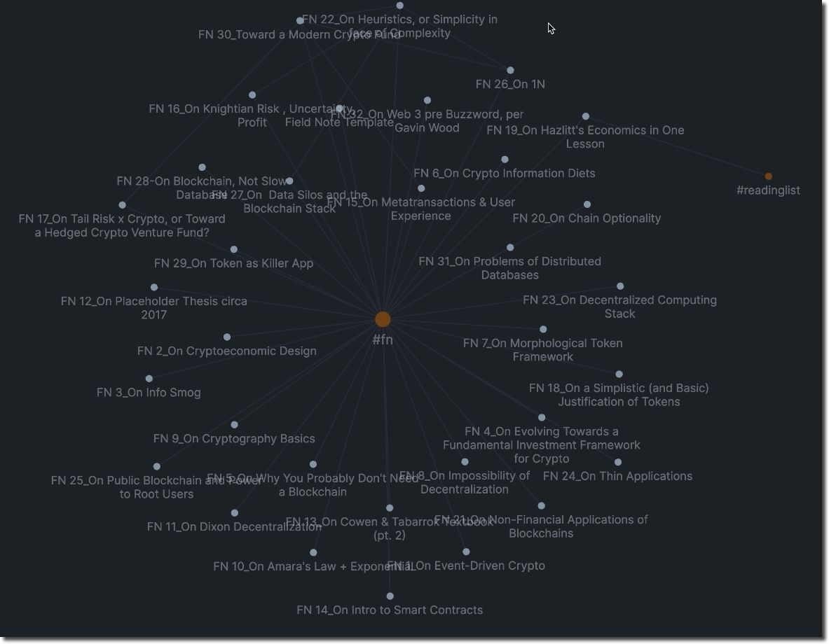 The output of this irreverence as it relates to my fundamentals-based interest in evaluating crypto (mal)investments is visualized in my current Field Note Cloud (largely unstructured, though the emergence of topic clustering forming):