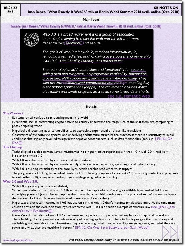 - Gavin Wood's definition of web 3.0: "an inclusive set of protocols to provide building blocks for application makers. These building blocks...present a whole new way of creating applications. These technologies give the user strong and verifiable guarantees about the information they are receiving, what information they are giving away, and what they are paying and what they are receiving in return." (see Field Note #32)