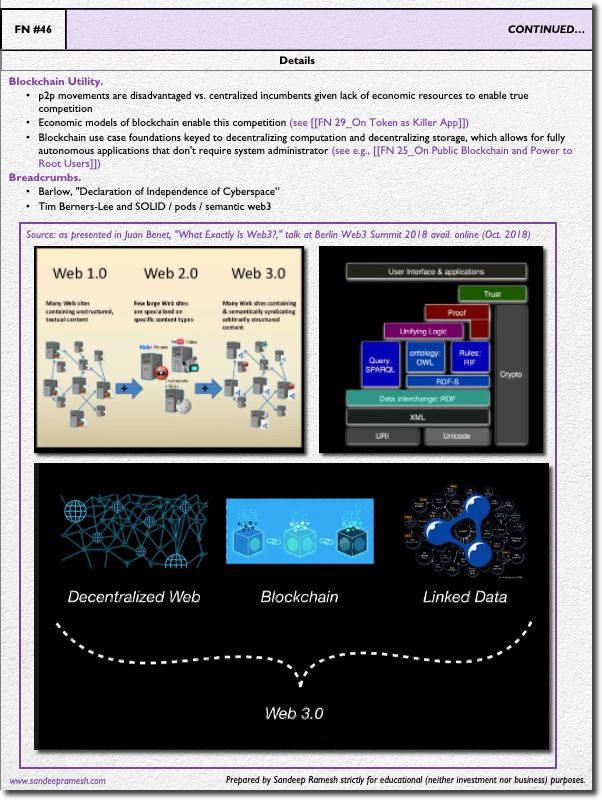 - Blockchain use case foundations keyed to decentralizing computation and decentralizing storage, which allows for fully autonomous applications that don't require system administrator (see e.g., Field Note #25)
