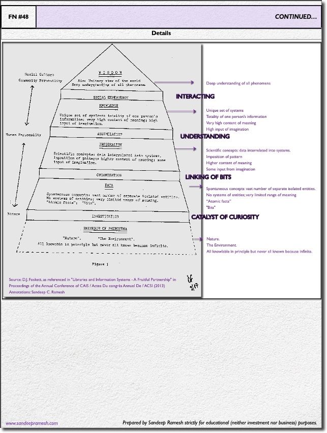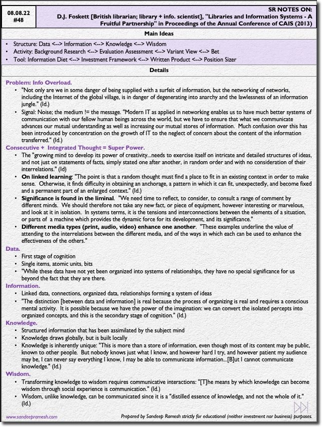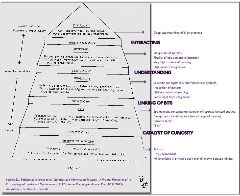This Field Note concerns the intensifying problem of information overload (see, e.g., FN 3_On Info Smog and FN 6_On Crypto Information Diets) by examining the relationships among data, information, knowledge, and wisdom. The source framework comes from Douglas John Foskett, a 20th century librarian, classificationist, and master of LIS (library & info science).