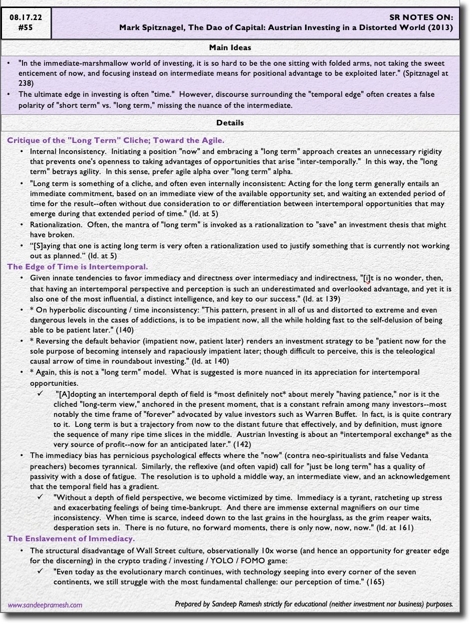 "In the immediate-marshmallow world of investing, it is so hard to be the one sitting with folded arms, not taking the sweet enticement of now, and focusing instead on intermediate means for positional advantage to be exploited later." (Spitznagel at 238)
