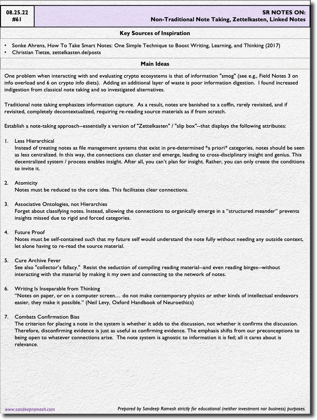 One problem when interacting with and evaluating crypto ecosystems is that of information "smog" (see e.g., Field Notes 3 on info overload and 6 on crypto info diets). Adding an additional layer of waste is poor information digestion. I found increased indigestion from classical note taking and so investigated alternatives.