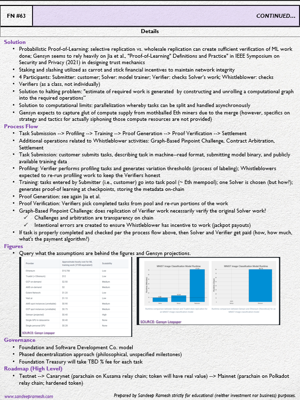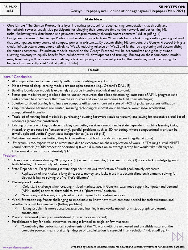 - One-Liner: "The Gensyn Protocol is a layer-1 trustless protocol for deep learning computation that directly and immediately rewards supply-side participants for pledging their compute time to the network and performing ML tasks...facilitating task distribution and payments programmatically through smart contracts." (Id. at pdf pg. 4)