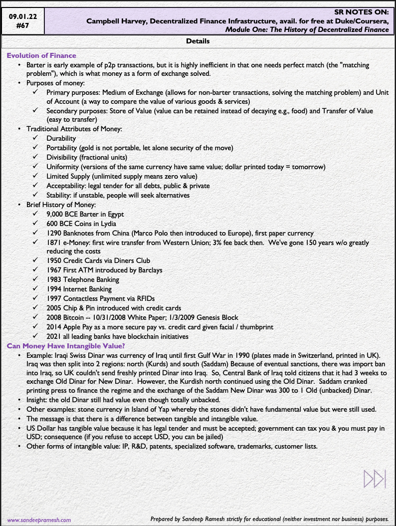 Here are companion notes to Campbell Harvey's Coursera/Duke course on DeFi. Specifically, Module 1: History of DeFi. Treatment of additional course modules to come.📚