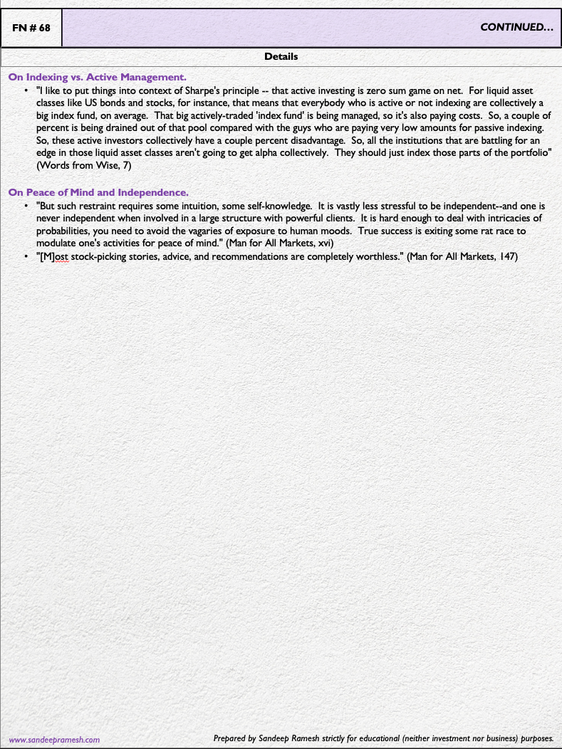 "It is vastly less stressful to be independent--and one is never independent when involved in a large structure with powerful clients. It is hard enough to deal with intricacies of probabilities, you need to avoid the vagaries of exposure to human moods. True success is exiting some rat rate to modulate one's activities for peace of mind."