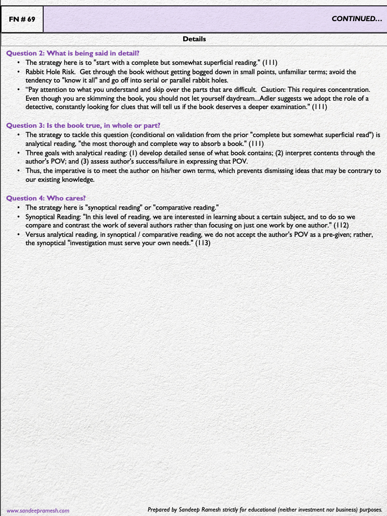 - Every text demands answering 4 questions (each one conditional upon validation of the prior): (1) what’s the text about as a whole? (2) what’s being written in detail? (3) is the text true, in whole or part? (4) why do I care?