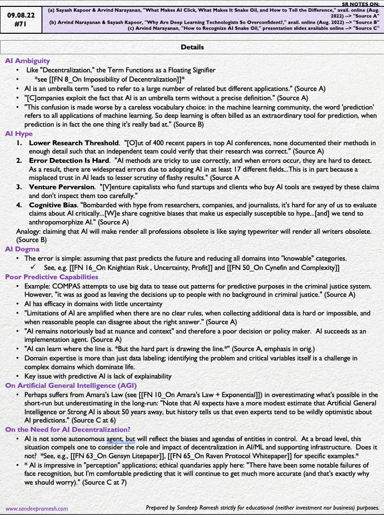 - Sayash Kapoor & Arvind Narayanan, "What Makes AI Click, What Makes It Snake Oil, and How to Tell the Difference," avail. online (Aug. 2022)