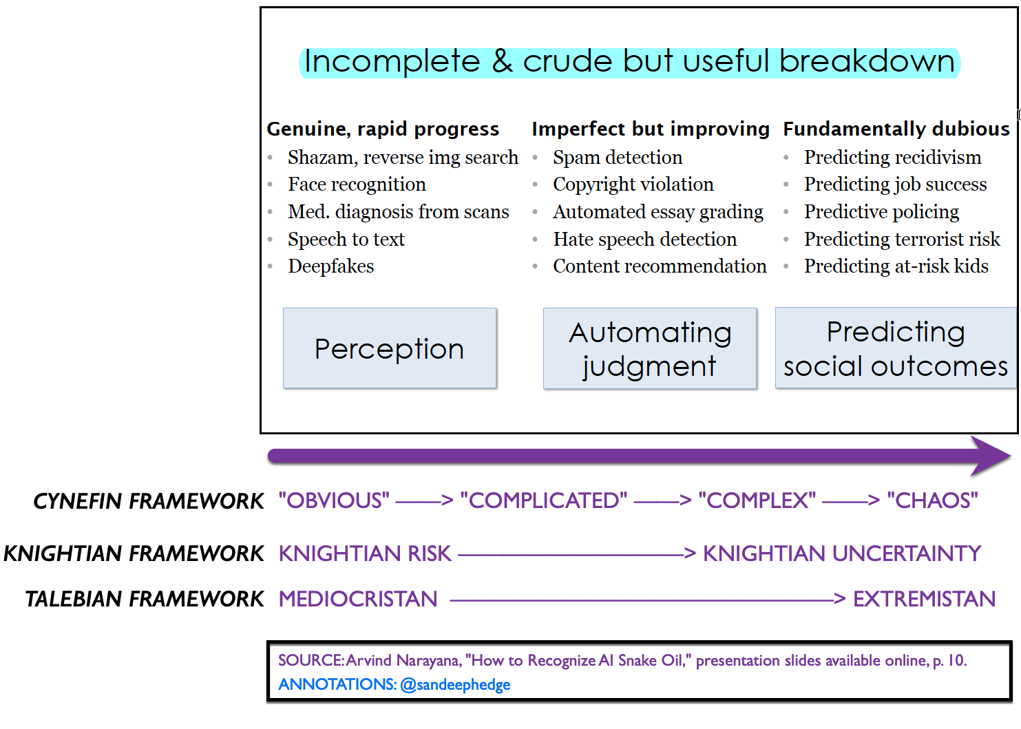 - Arvind Narayanan, "How to Recognize AI Snake Oil," presentation slides avail. online (Nov. 2019)